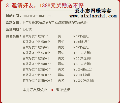 活动时间为2013年9月3日至12月31日。每周排名前100名的推广的会员,均可以获得从第一名3000元现金,到最后100名30元不等的现金奖励,每个周期总奖励额度是1万元。