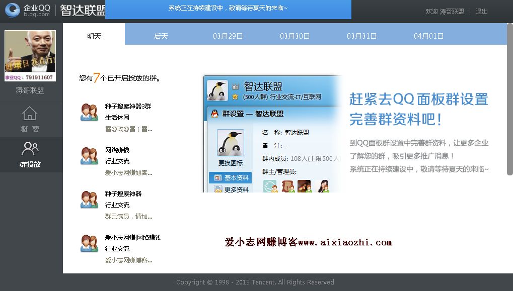 而关于智达联盟主要的适宜人群,则主要是QQ群的群主,投放广告者一般是企业,所以,趁着现在智达联盟处于初步的发展期,所有QQ用户都可以加入,我们不妨多建几个QQ群,多多拉拢一些人员进入。或者爱小志在这里可以给大家提供一个利用QQ群的赚钱思路:您可以去淘宝网购买QQ群,购买那些QQ群人员在50人以上的QQ群(当然QQ群人员越多越好,人气越高越好)